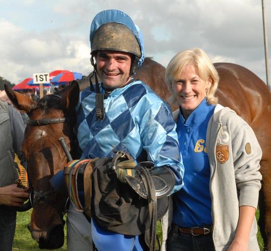 Loughanmore 21-10-06. Jockey BRIAN HASSETT is joined by Denise Sneezy Foster,Trainer of SO I'M TOLD after he recorded his 200th win between the flags. Photo Healy Racing.