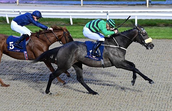 He loved it (surface) - that's what Wayne said, he was always in his comfort zone. He's in the sales on Monday so if somebody wants fun for the winter, he is there for sale. We'll see what happens. He's a very good-actioned horse. He got bogged down in the Curragh last week, but he had a couple of good runs before that. It took me a while to learn that he didn't want soft. I ran him in Listowel and it was too soft for him and I still didn't learn, and I went back to the Curragh. He's a nice horse and he is only developing, he's a big raw horse so there is more improvement in him. We are flying it, they are in top order. One lifts the other, they are working together and they are all coming on. That's 19 winners for the year.