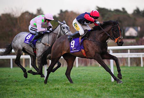 The line just came in time. She probably got there a shade soon. She travelled very well and jumped the last well and she was there. She probably got a little bit lonely and the line just came in time. It's a great pot to win for a mare, she won it last year and she was three pound higher today. The second, third and fourth from last year have all done well since. She ran a nice race here at Christmas when the ground was very testing, and the second horse in that has won twice since. She was always going to come back for this race but after the 7mm of rain overnight I was worried. It's lovely for a small trainer like me to have a winner here today. She might go over fences and it would be lovely to get a bit of blacktype with her.